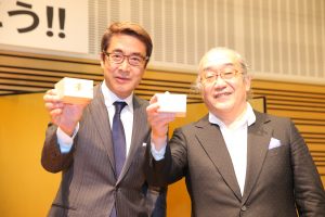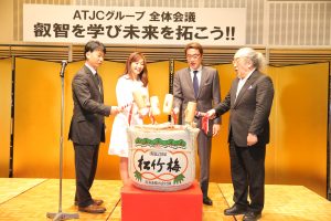 会食スペースで和やかに歓談が行われる中会社の益々の発展を祈願しての鏡開き