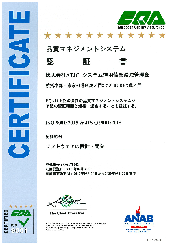 この度、株式会社ATJCは、情報セキュリティマネジメントシステム(ISMS)の国際規格である「ISO/IEC 27001:2013 / JIS Q 27001:2014」の認証、品質マネジメントの国際規格である「ISO9001:2015 & JIS Q 9001:2015」の認証を取得しました。弊社は、当社に関わる情報を適切に管理し、当社の事業に関わる全ての人々の満足を得る事を目標として、信頼・安心される会社を目指します。